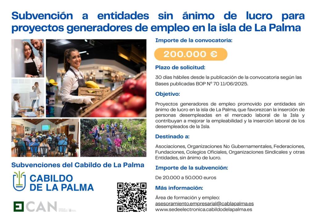 El objetivo de esta iniciativa es impulsar nuevos servicios vinculados al empleo que favorezcan la inserción laboral de personas desempleadas y fortalezcan el tejido social de la isla. Las entidades beneficiarias podrán ser asociaciones, ONGs, federaciones, fundaciones, colegios oficiales y sindicatos que tengan sede o delegación permanente en La Palma y desarrollen actividades en materia de formación y/o empleo.